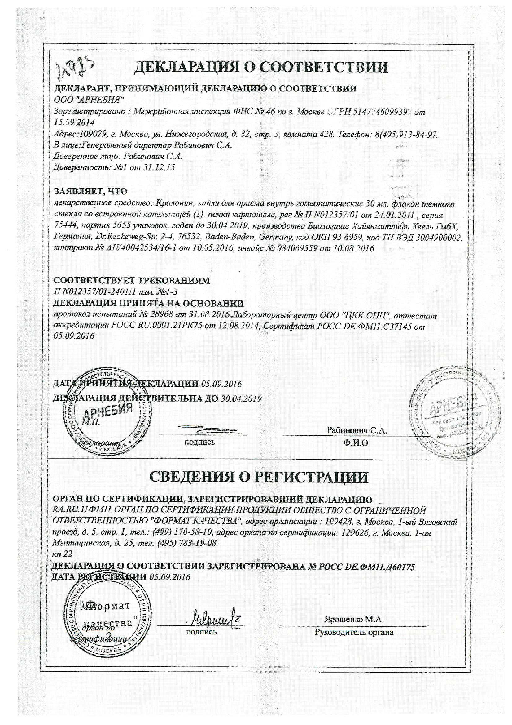 Кралонин - многокомпонентный гомеопатический препарат, который обладает успокаивающим и спазмолитическим воздействием. Cralonin нормализует артериальное давление и обеспечивает улучшение работоспособности кровеносной структуры по доставке кровяной жидкости к сердечной мышце.