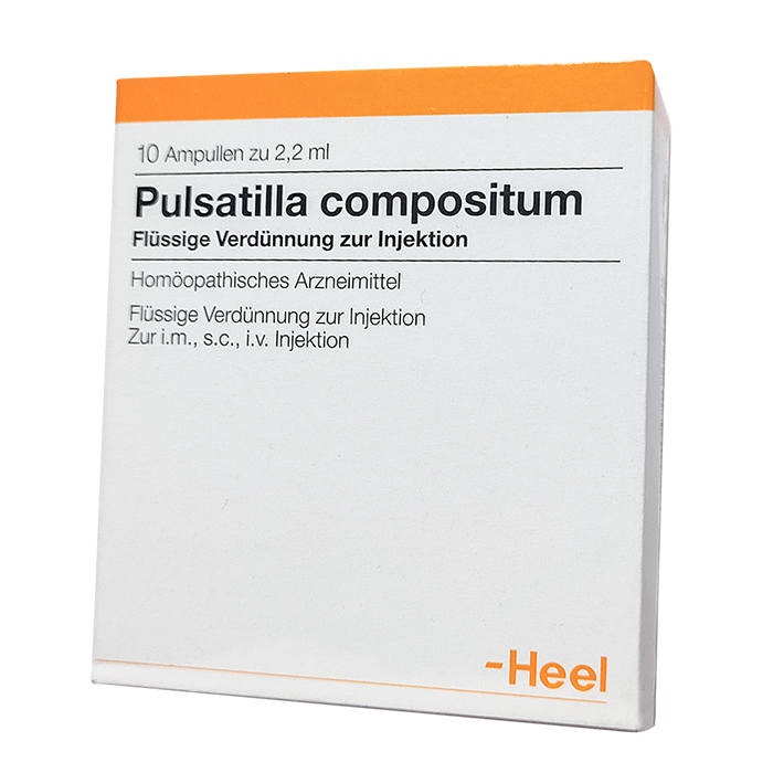 1 ампула (2,2 мл) препарата Пульсатилла композитум содержит по 22 мкл следующих гомеопатических компонентов: пульсатилла пратенсис D6, сульфур D8, кортизонум ацетикум Д18. Вспомогательный компонент: натрия хлорида изотонический раствор.